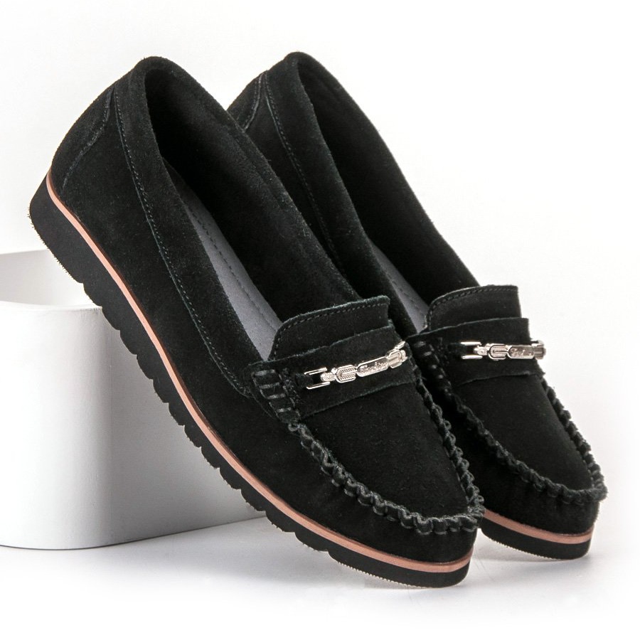 As decorações de metal nos dedos acrescentam chique e elegância, e a clássica cor preta faz com que combinem com muitos estilos. O design slip-on torna fácil e conveniente calçar e tirar os sapatos. Estes mocassins caracterizam-se por uma biqueira redonda e um salto macio incorporado, o que aumenta ainda mais o seu conforto.