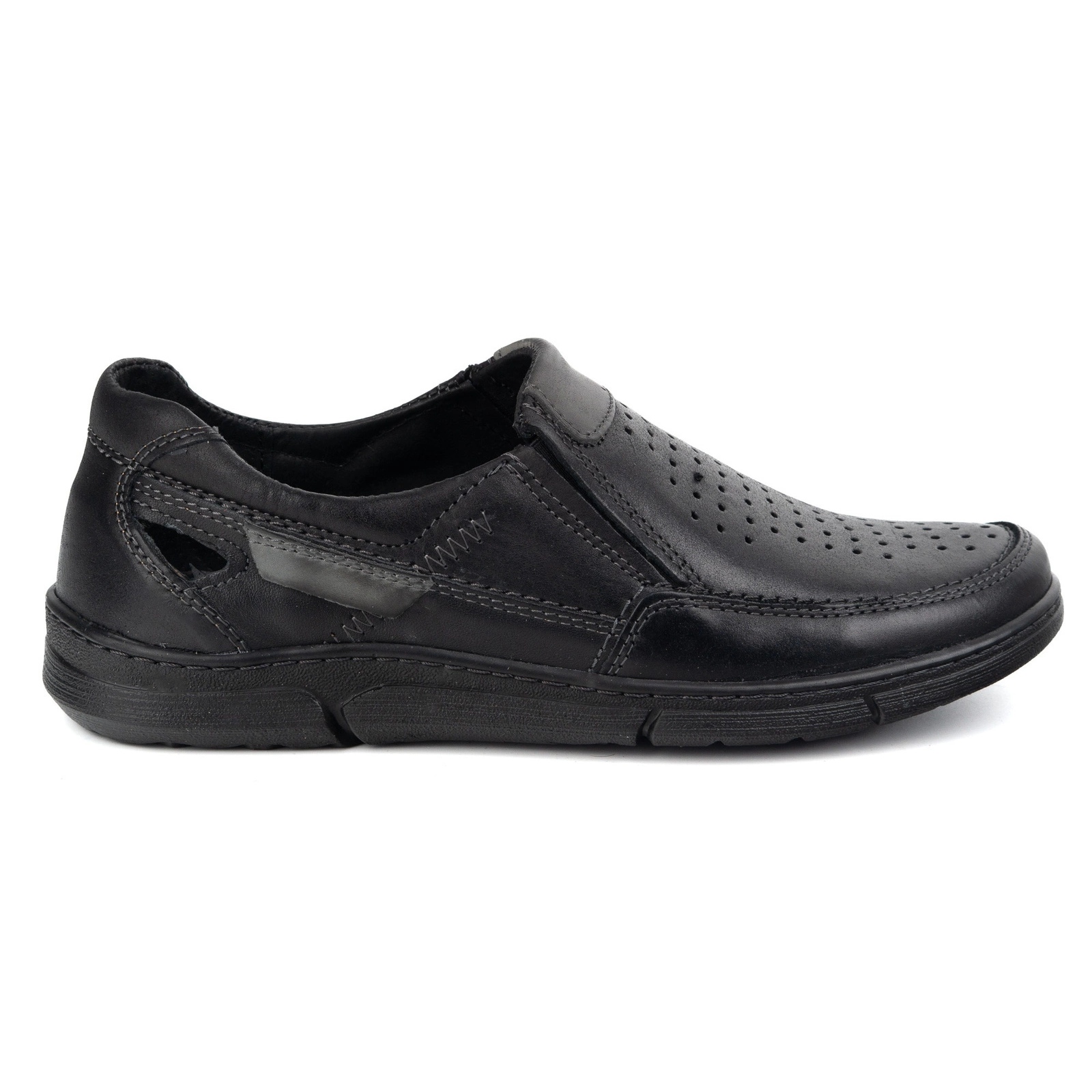 Sapatos de Olivier Momentos de couro masculinos para o verão 602 em preto é uma ótima opção para homens que valorizam o conforto e o estilo nos dias de verão. Esses sapatos deslizantes se diferenciam por um padrão de trabalho aberto, que não apenas parece elegante, mas também fornece respirabilidade excepcional. Graças ao uso de couro bovino natural de alta qualidade, os sapatos garantem a durabilidade e a conveniência de usar por um longo tempo.