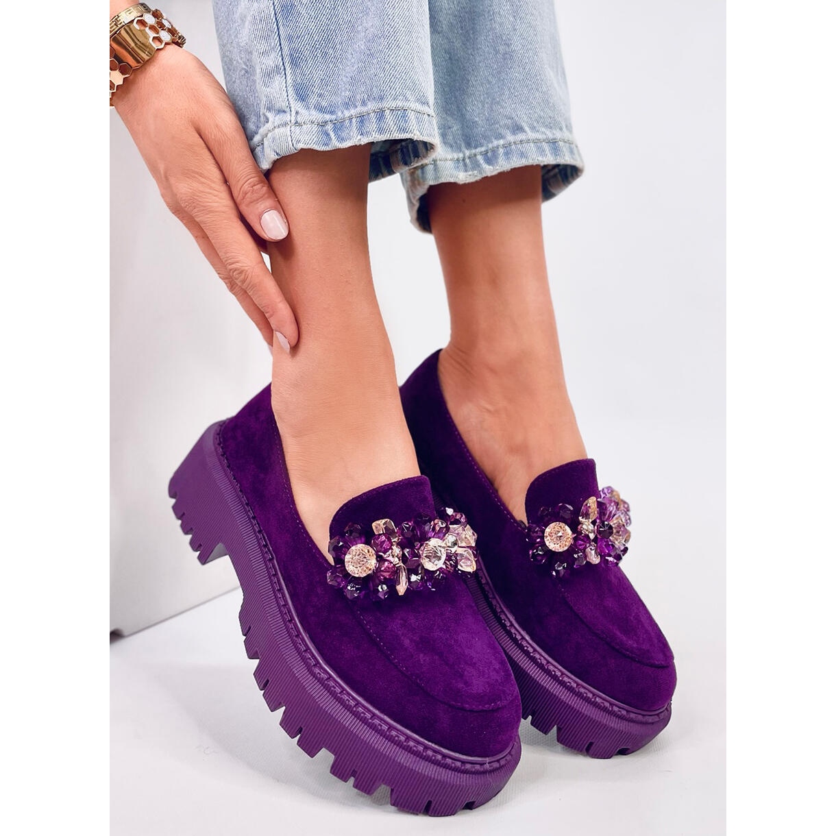 Os mocassins Heidi Purple com cristais são a escolha perfeita para mulheres que querem se destacar na multidão. Estes lindos mocassins roxos sobre plataforma plana combinam elegância e estilo extraordinário, graças aos acessórios em forma de cristais brilhantes. São sapatos perfeitos para o dia a dia que podem ser combinados com sucesso com roupas mais formais, acrescentando um toque de extravagância a qualquer look.