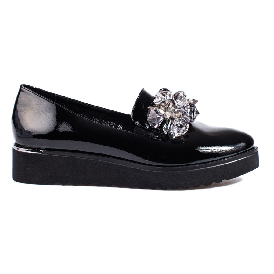 Detalhes: Mocassins de mulher sobre plataforma lacado preto Vinceza