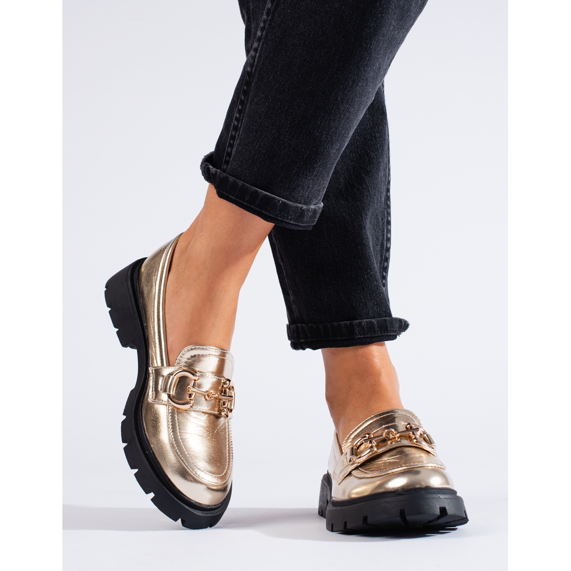 - Modelo: Mocassins dourados com sola grossa