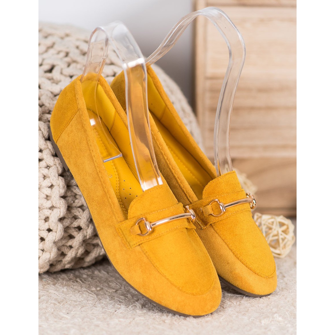 Os elegantes mocassins com decoração amarela da marca Bestelle são a escolha perfeita para mulheres que desejam adicionar frescor e originalidade ao look do dia a dia. Estes sapatos fenomenais distinguem-se não só pela sua cor bonita e viva, mas também por uma fivela decorativa única que chama a atenção e realça o estilo original.