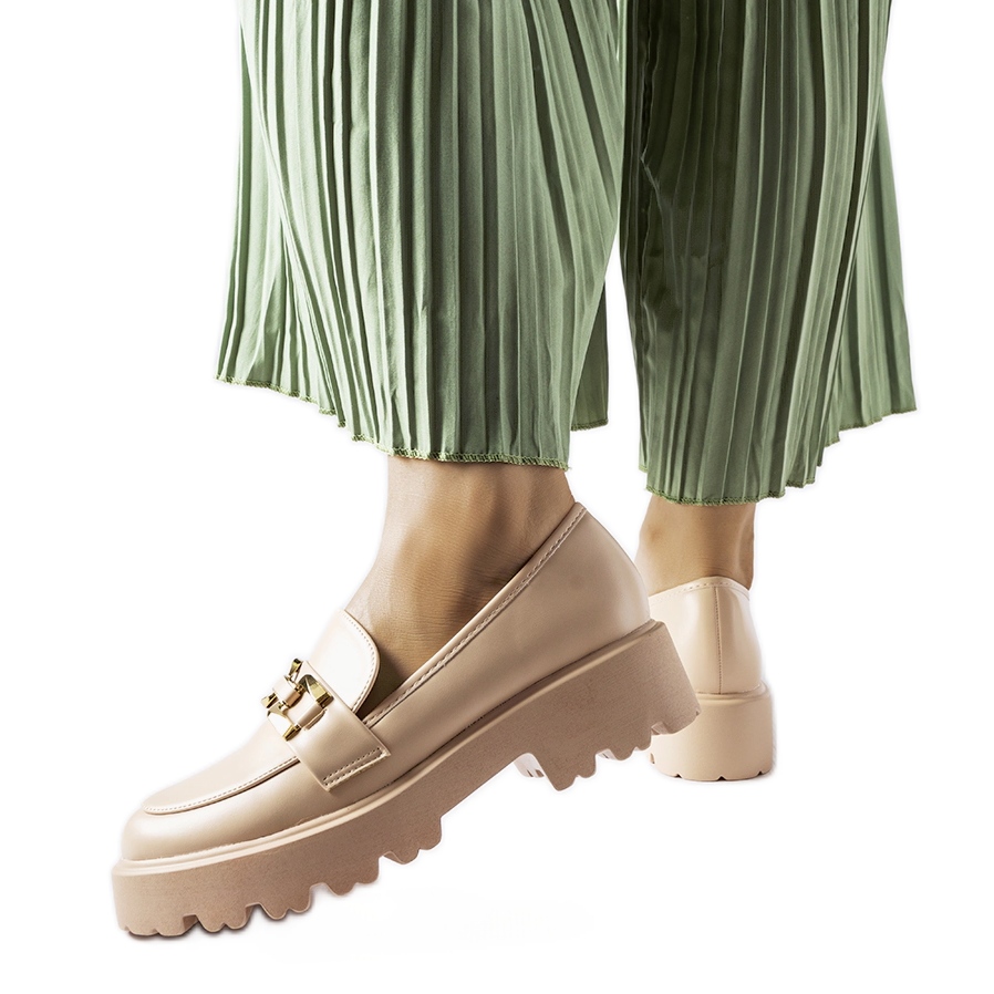 Classic, e ao mesmo tempo os mocassins das mulheres modernas, que funcionarão diariamente e para ocasiões mais elegantes. Os sapatos baixos e deslizantes em uma cor bege universal são decorados com uma fivela decorativa com uma corrente delicada, adicionando caráter e brilho sutil. Feito de couro ecológico, com uma inserção de material confortável e uma sola de borracha flexível - o conforto do desgaste anda de mãos dadas com uma aparência elegante.