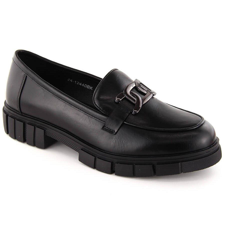 Moccasins Sapatos femininos com uma corrente Black Potocki 12440 é uma proposta elegante que certamente atrairá os amantes de estilo casual. Feito de couro ecológico de alta qualidade, eles garantem não apenas aparência estética, mas também o conforto do uso. Equipados com uma inserção de couro natural, eles permitem uso longo a longo prazo sem uma sensação de desconforto.