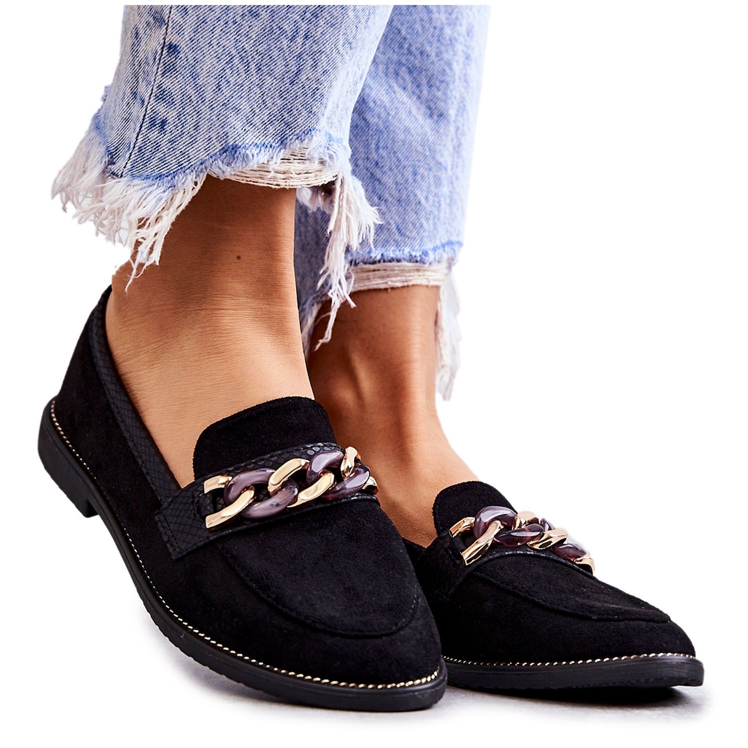 FB2 FB2 Mocassins femininos de camurça com uma corrente de unhas pretas preto