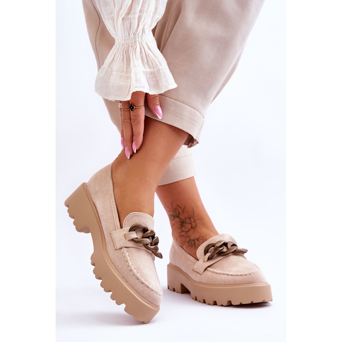 Mocassins clássicos feitos de eco-eixo macio em um tom bege universal (bege com detalhes em marrom). O modelo é decorado com uma corrente sutil na frente, montada em uma sola estável com um aumento delicado (calcanhar de 5,5 cm, plataforma de 3,5 cm). A estrutura inserida com um salto ligeiramente rígido garante dobramento fácil e bom pé. A inserção de couro ecológica garante o conforto de uso ao longo do dia.