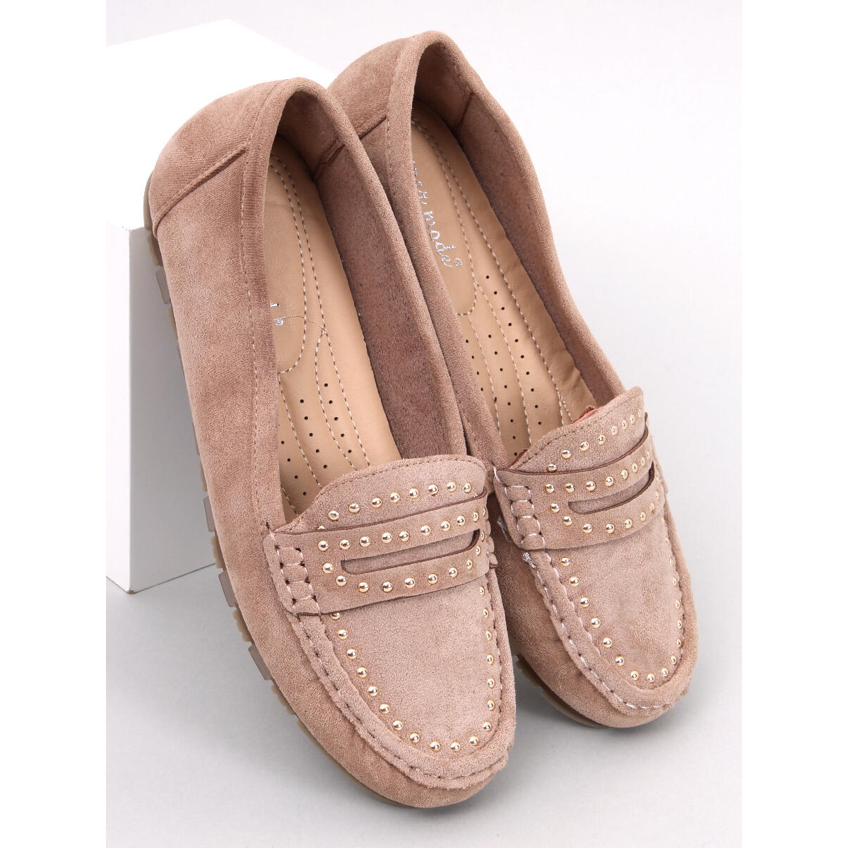 Os mocassins elegantes na sombra cáqui-beż é uma combinação de conforto e estilo sutil. A parte superior de camurça feita de couro ecológico decorado com pregos delicados e strass cria um padrão único e atemporal que funcionará nas estilizações cotidianas.