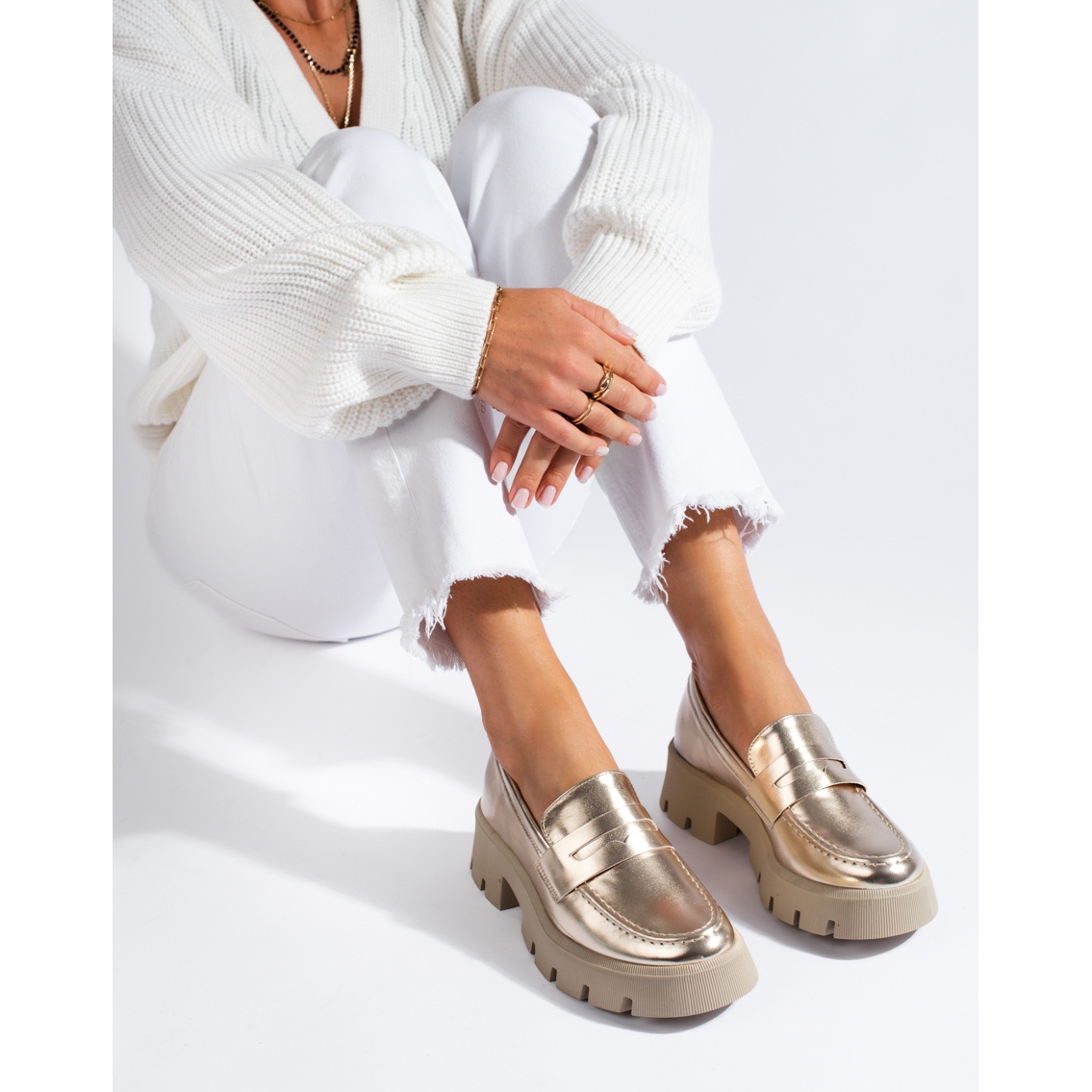 Detalhes: Mocassins femininos dourados com sola grossa da Shelovet