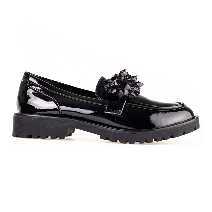 Detalhes: Mocassins femininos Shelovet lacados com cristais pretos
