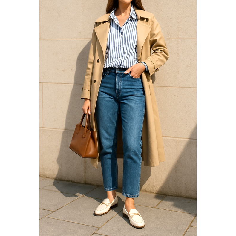 Use mocassins de couro branco ou creme com jeans clássicos de corte reto. Combine-os com uma camisa listrada e um sobretudo bege, criando um estilo no espírito da elegância parisiense. Esse look é perfeito para passear pela cidade, encontrar amigos ou fazer compras. Mocassins brilhantes alongam opticamente as pernas e adicionam leveza a todo o visual.