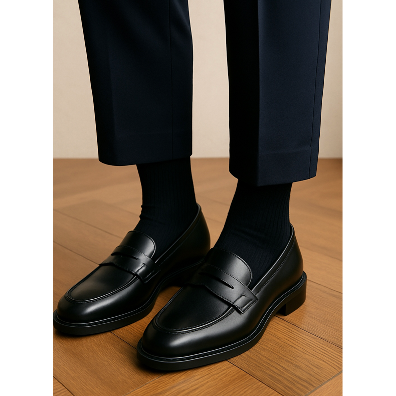 Em estilos formais de escritório, é melhor usar mocassins com meias. Escolha modelos finos em uma cor que combine com sua calça ou sapato. Os mocassins pretos exigem meias pretas, os marrons exigem meias marrons. Evite meias esportivas brancas, que reduzirão imediatamente a elegância de todo o look. As meias devem atingir uma altura suficiente para que nenhuma pele fique visível entre a borda superior das meias e a perna da calça.