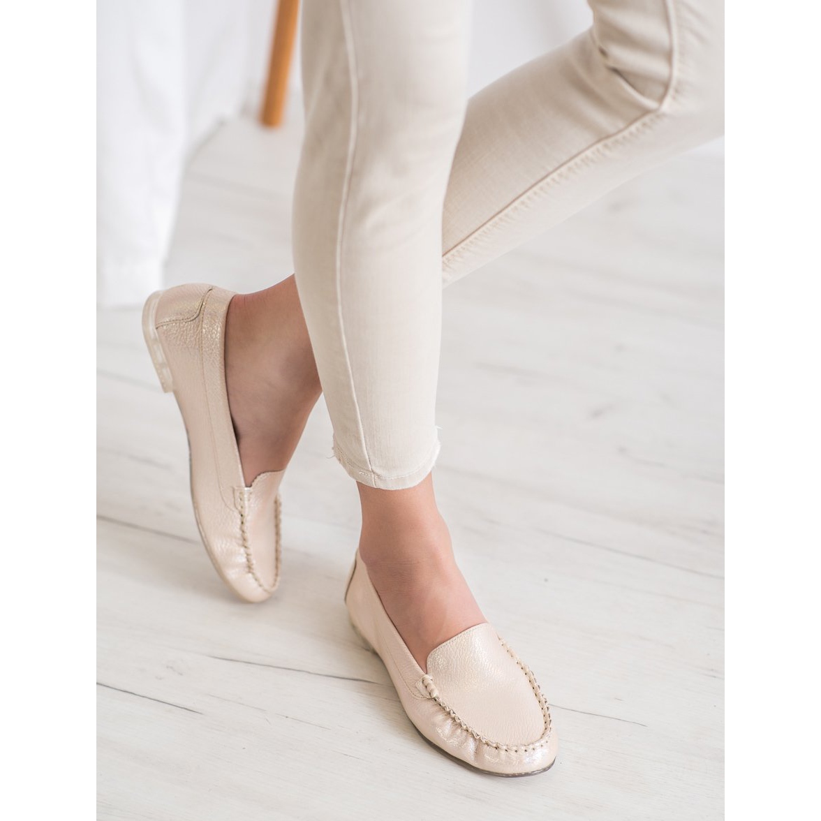 Os mocassins têm biqueira arredondada, decorada com costuras sutis, o que lhes confere um caráter clássico. Graças ao salto macio integrado e à sola plana de plástico, estes sapatos são perfeitos para o uso diário e para ocasiões especiais.