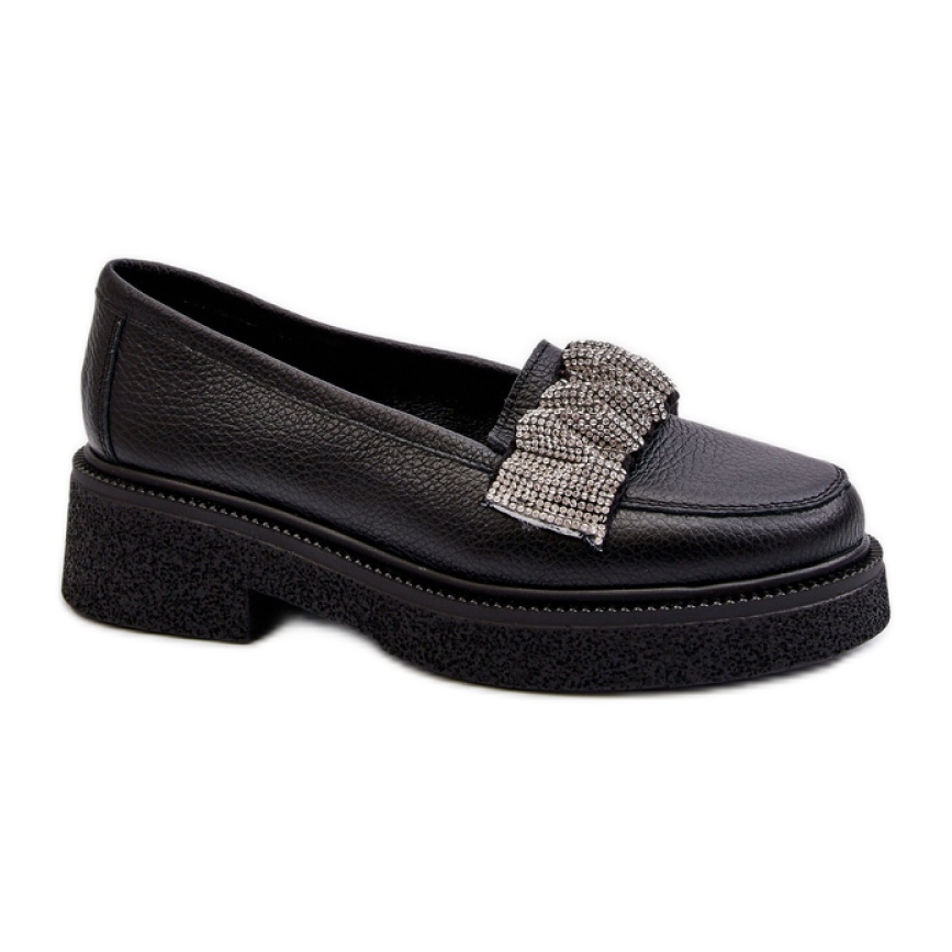 A cor preta lhes dá universalidade, graças à qual eles se misturam perfeitamente com estilizações formais e roupas casuais. A frente do sapato é decorada com uma sutil alça forjada, decorada com pequenos zircões, dando ao brilho um pouco de brilho. Graças a esses sotaques elegantes, esses mocassins serão um ótimo complemento para qualquer guarda -roupa.