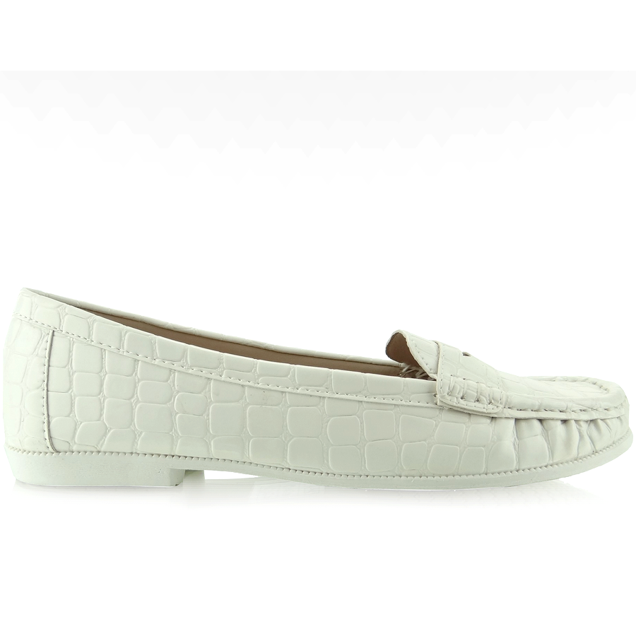 Mocassins femininos - textura de pele de cobra patenteada, branco