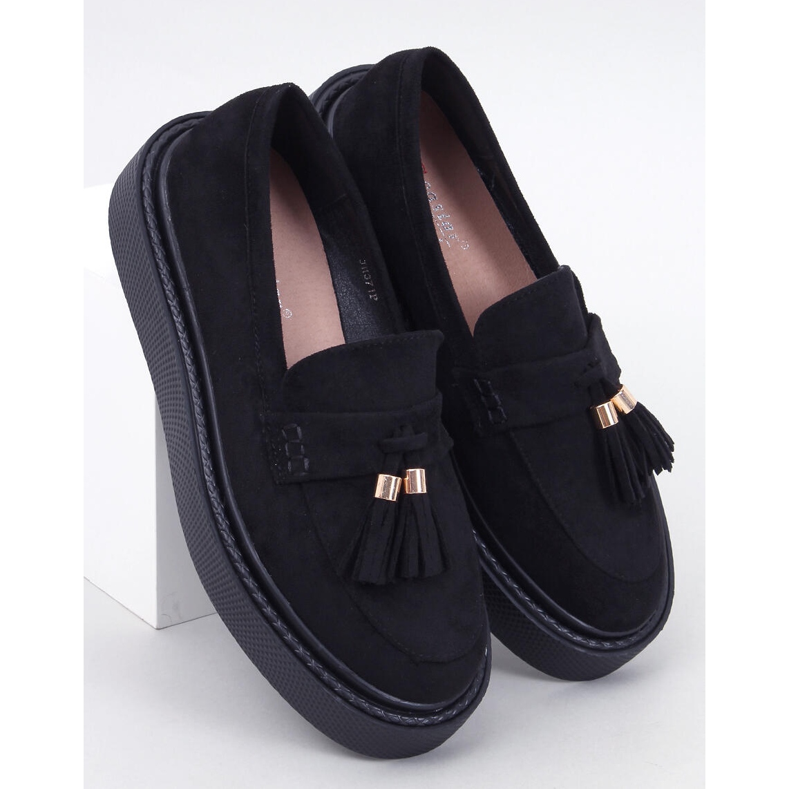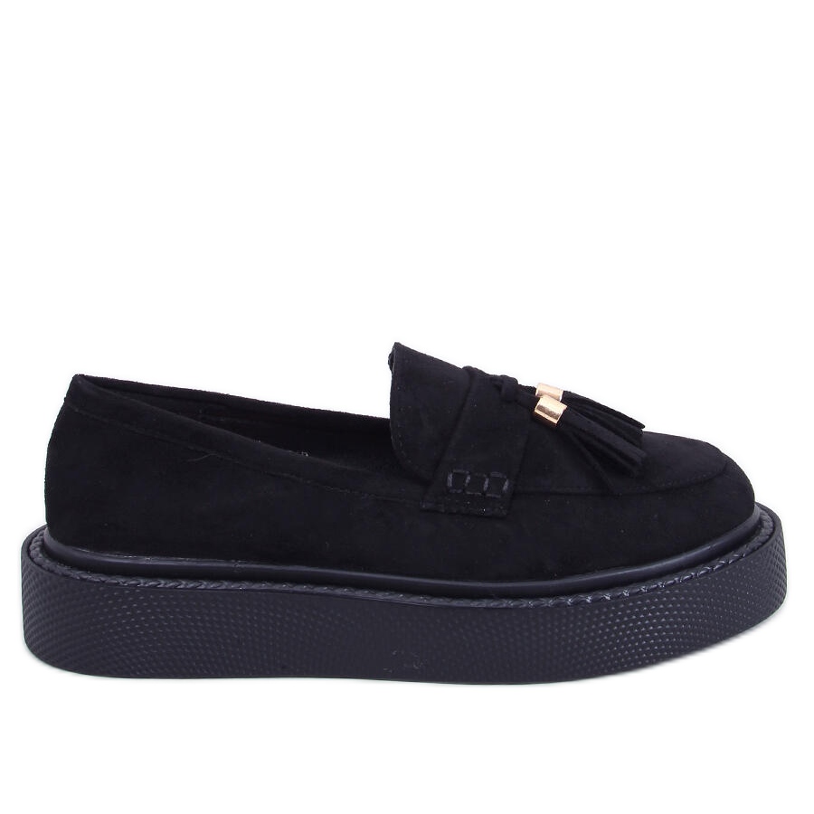 Descubra o último sucesso no mundo da moda - mocassins pretos na plataforma com franjas! Esses sapatos únicos de mulheres são a quintessência de um estilo moderno que permite que você combine livremente a elegância com conforto. Feito de camurça ecológica de alta qualidade, eles parecem extremamente impressionantes e sua superfície lisa combina perfeitamente com várias estilizações.