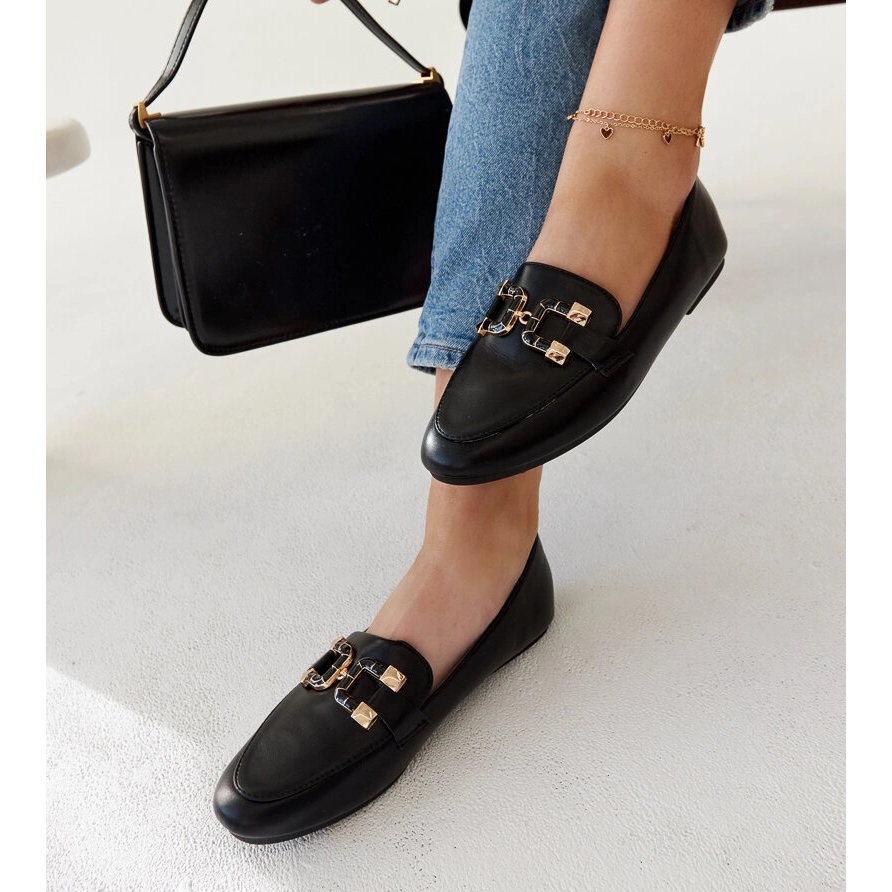 Os mocassins pretos com Comerio Buckle são uma ótima opção para mulheres que procuram calçados elegantes e confortáveis para os dias de verão. O nariz de amêndoa oferece conforto, e a estrutura inserida torna a instalação e a remoção de sapatos extremamente simples. Feito de pele plástica e ecológica durável, eles são distinguidos pela leveza e design moderno, o que os faz se misturar bem com várias estilizações.