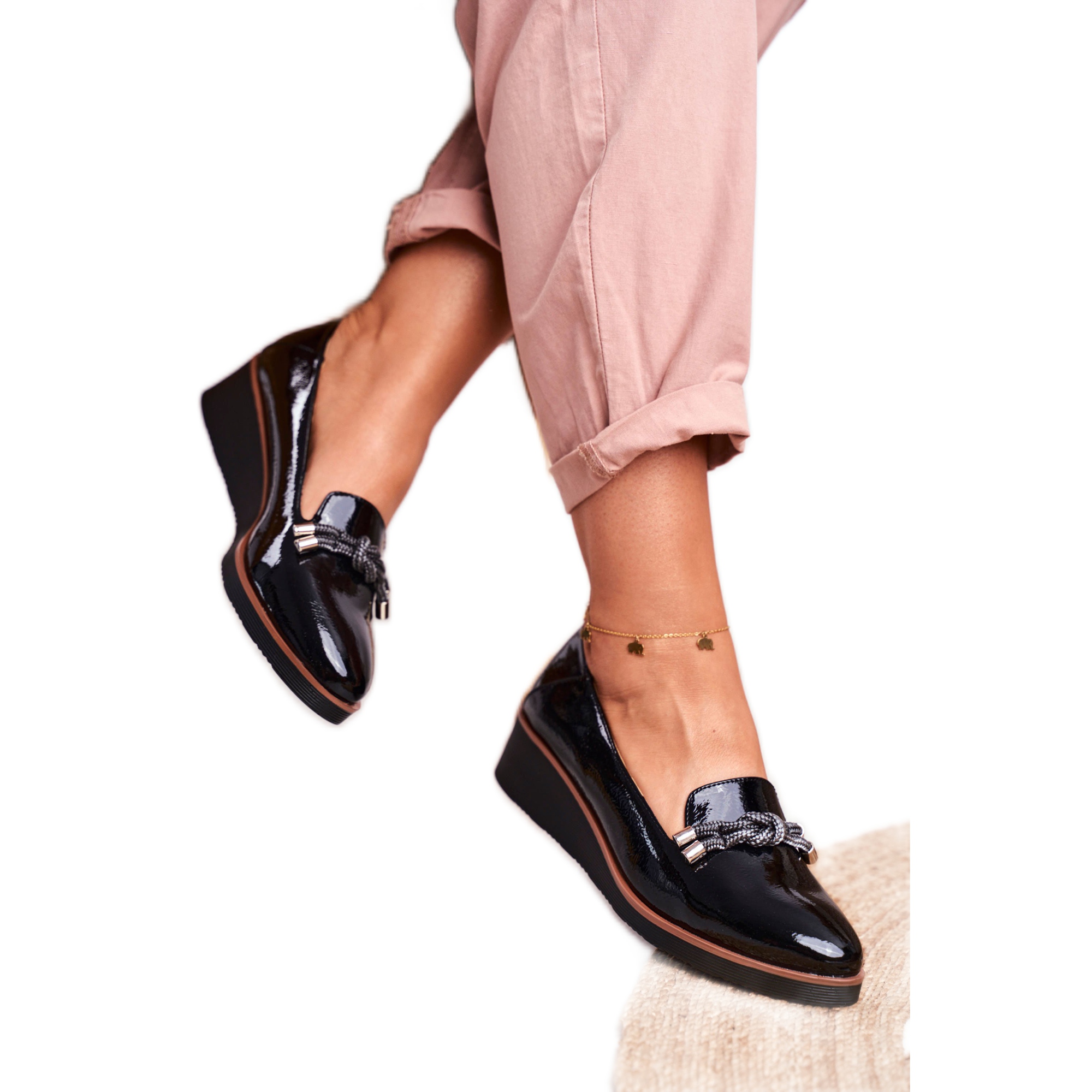 Detalhes: Vinceza Mocassins pretos femininos lacados na cunha Abba cinza