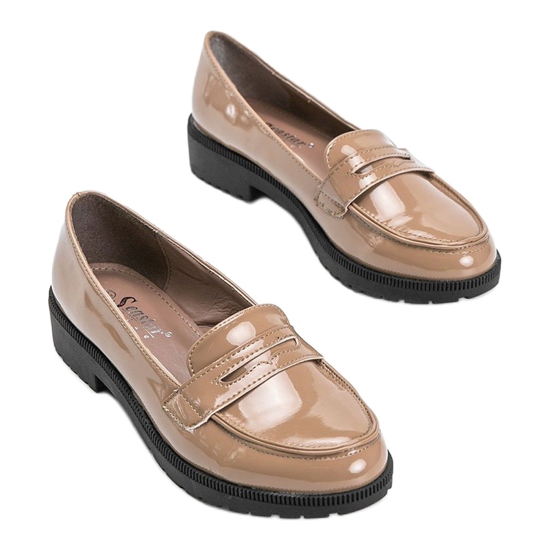 Os mocassins de couro envernizado bege da Sis são a escolha perfeita para mulheres que desejam combinar elegância com conforto. Estes sapatos elegantes com sola grossa são feitos de couro ecológico, o que os torna únicos. Seu design clássico foi combinado com um acabamento moderno, o que os torna uma excelente opção para o uso diário.