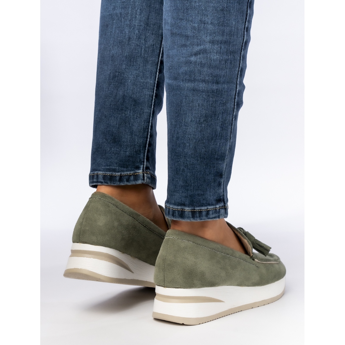Graças à inserção, colocar mocassins se torna rápido e confortável. No interior, existem inserções de material que garantem o conforto de uso. A única única harmonia harmoniosamente com uma parte superior verde, dando ao todo uma expressão elegante.