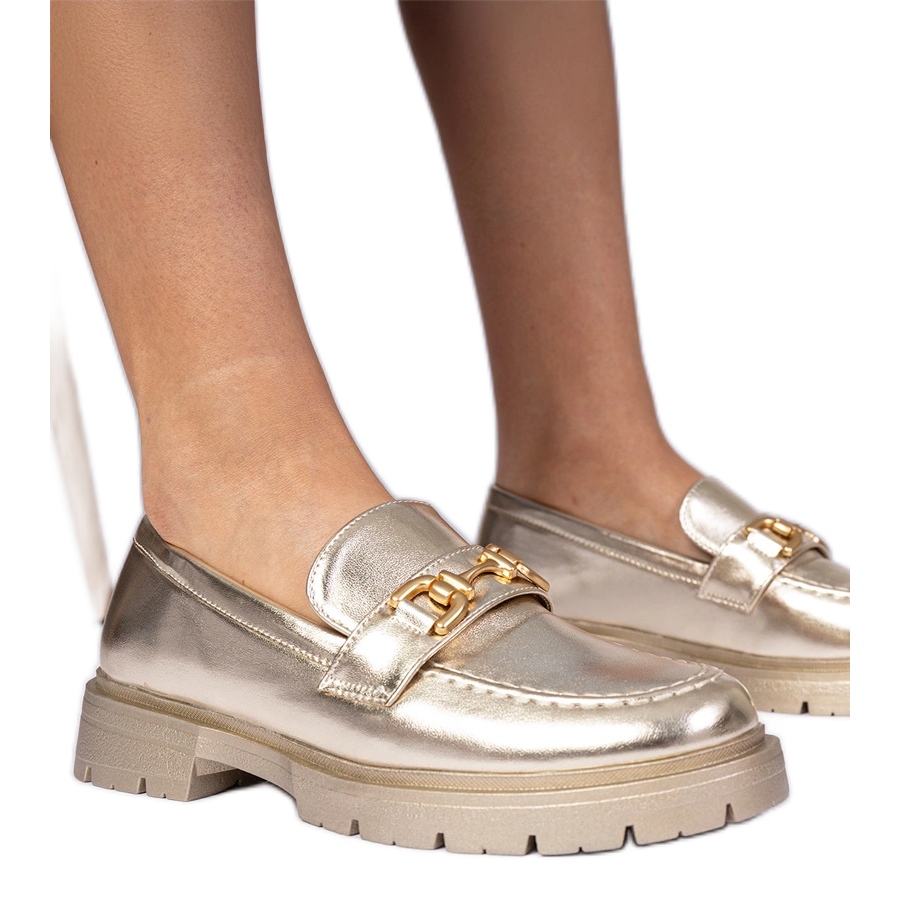 Apresentamos mocassins Golden elegantes do Eco -Leather - um elemento inseparável de guarda -roupa de todas as mulheres elegantes. Esses sapatos de ouro exclusivos não são apenas distinguidos por um acabamento brilhante, mas também uma cadeia metálica elegante que lhes dá um personagem único.