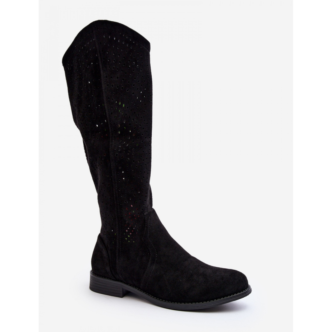 Situado em um salto plano e estável com uma altura de 3 cm, assegure o conforto ao longo do dia. A parte superior do OpenWork, chegando no joelho, dá a eles um personagem único, e o nariz arredondado enfatiza o corte clássico de cossacos.