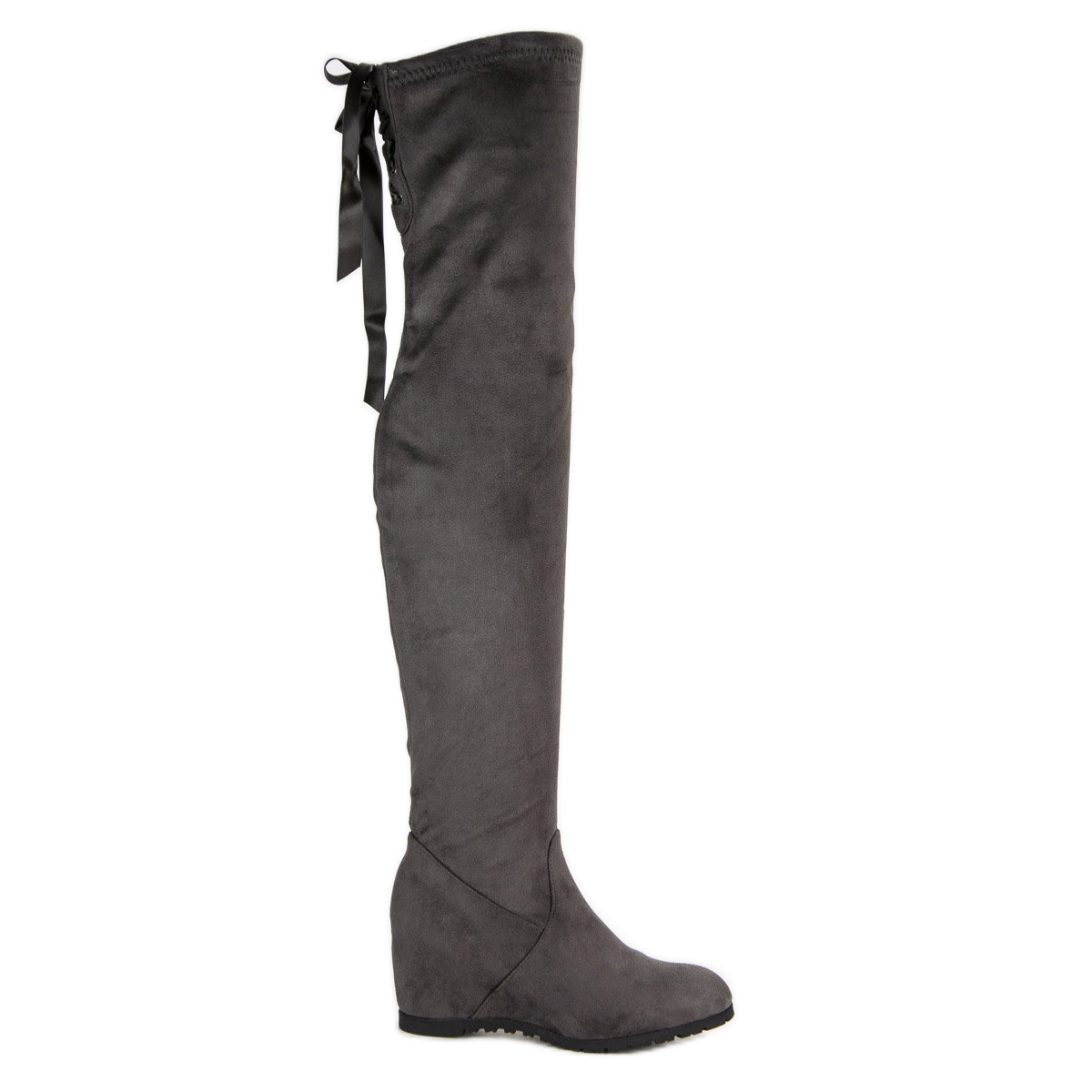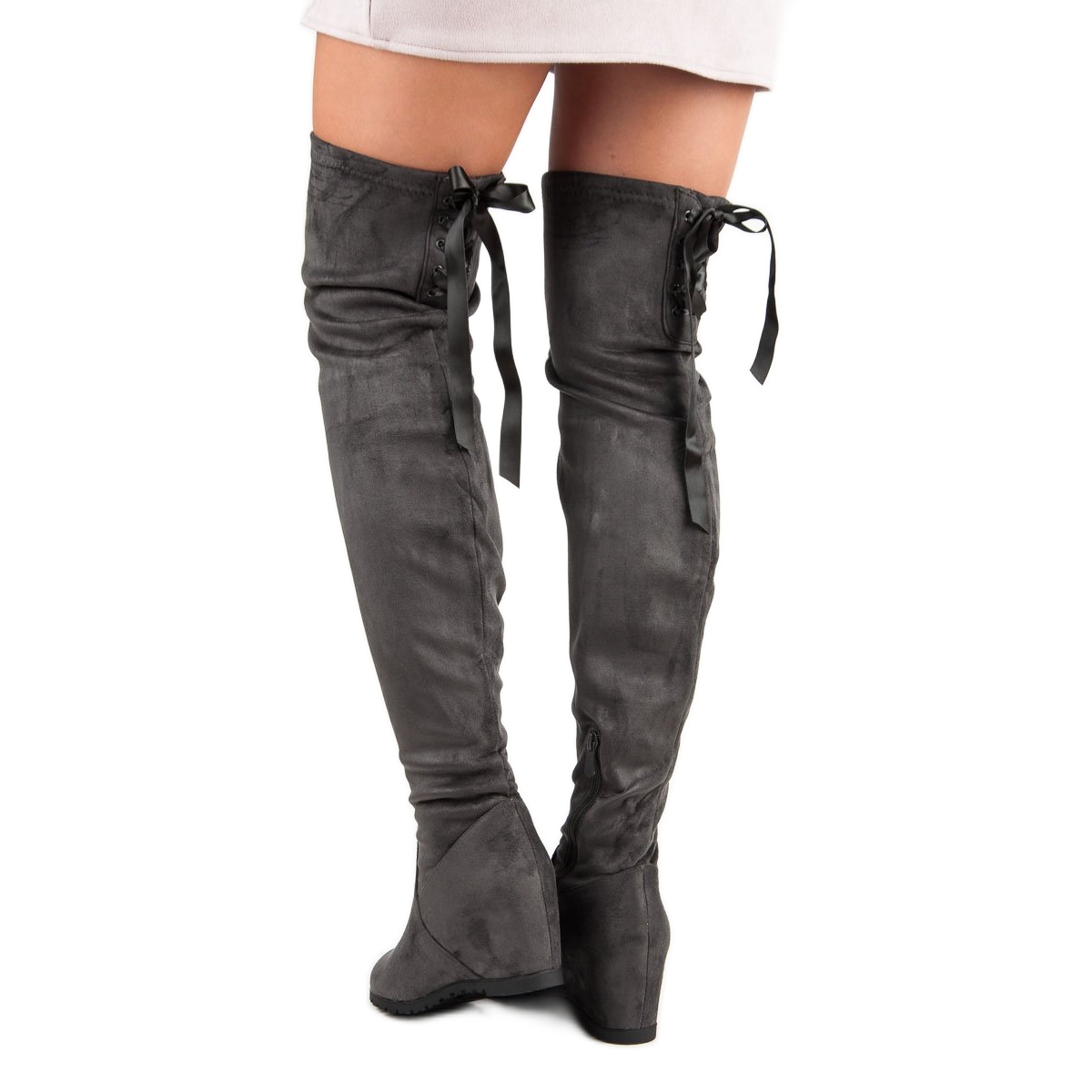 Botas acima do joelho em camurça ecológica em um elegante tom de cinza são o complemento perfeito para qualquer guarda-roupa. O cano alto, acima do joelho, não só acrescenta carácter, mas também protege eficazmente contra o frio. Zíper e laço extremamente práticos permitem um ajuste perfeito e fácil colocação.