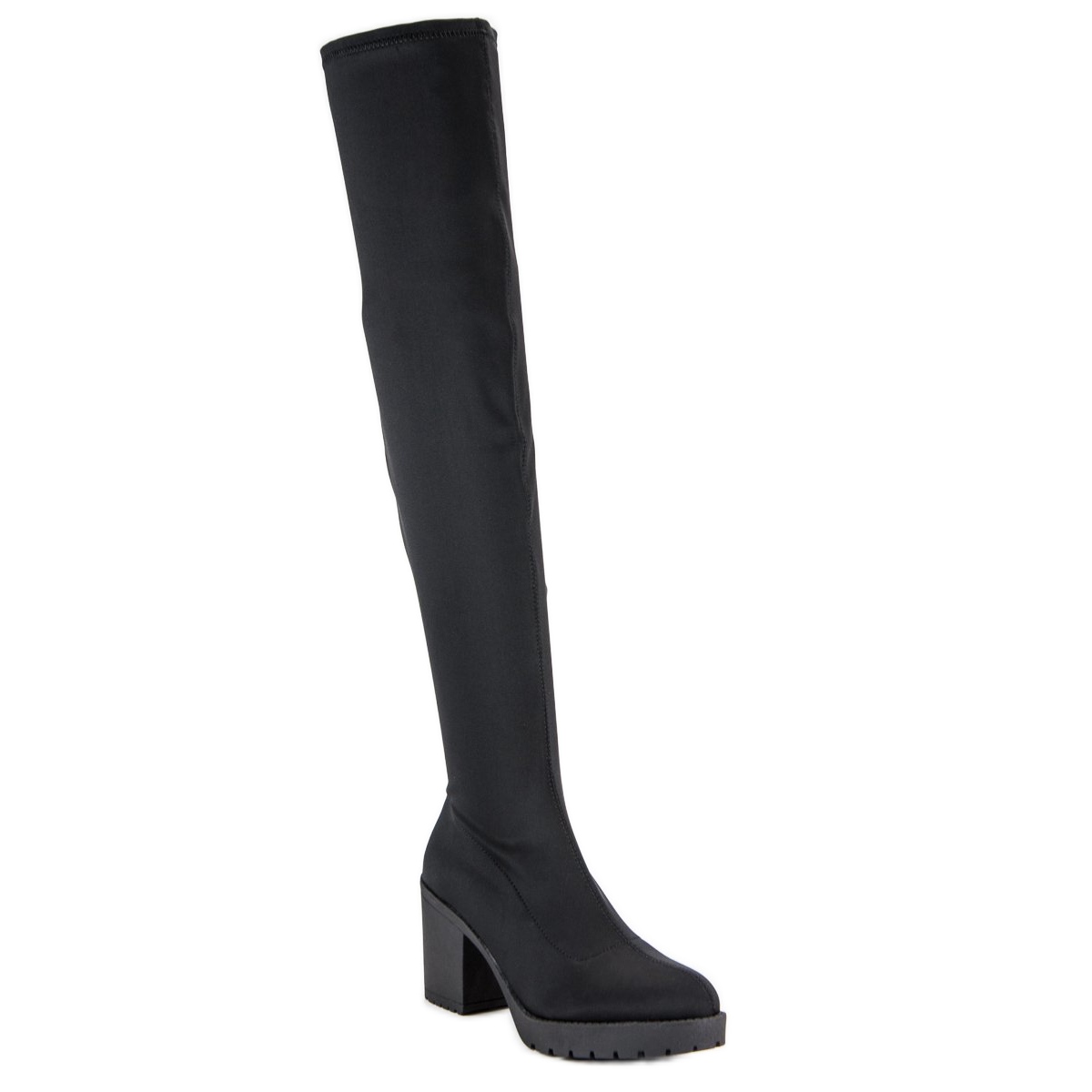Estes mosqueteiros foram concebidos tendo em mente o máximo conforto e estética. Graças à utilização de material com mistura de Lycra, o cabedal se ajusta perfeitamente à perna, eliminando a preocupação com o escorregamento do calçado. A plataforma grossa e o salto de 8,5 centímetros em forma de bloco não só alongam a silhueta, mas também proporcionam estabilidade ao caminhar.