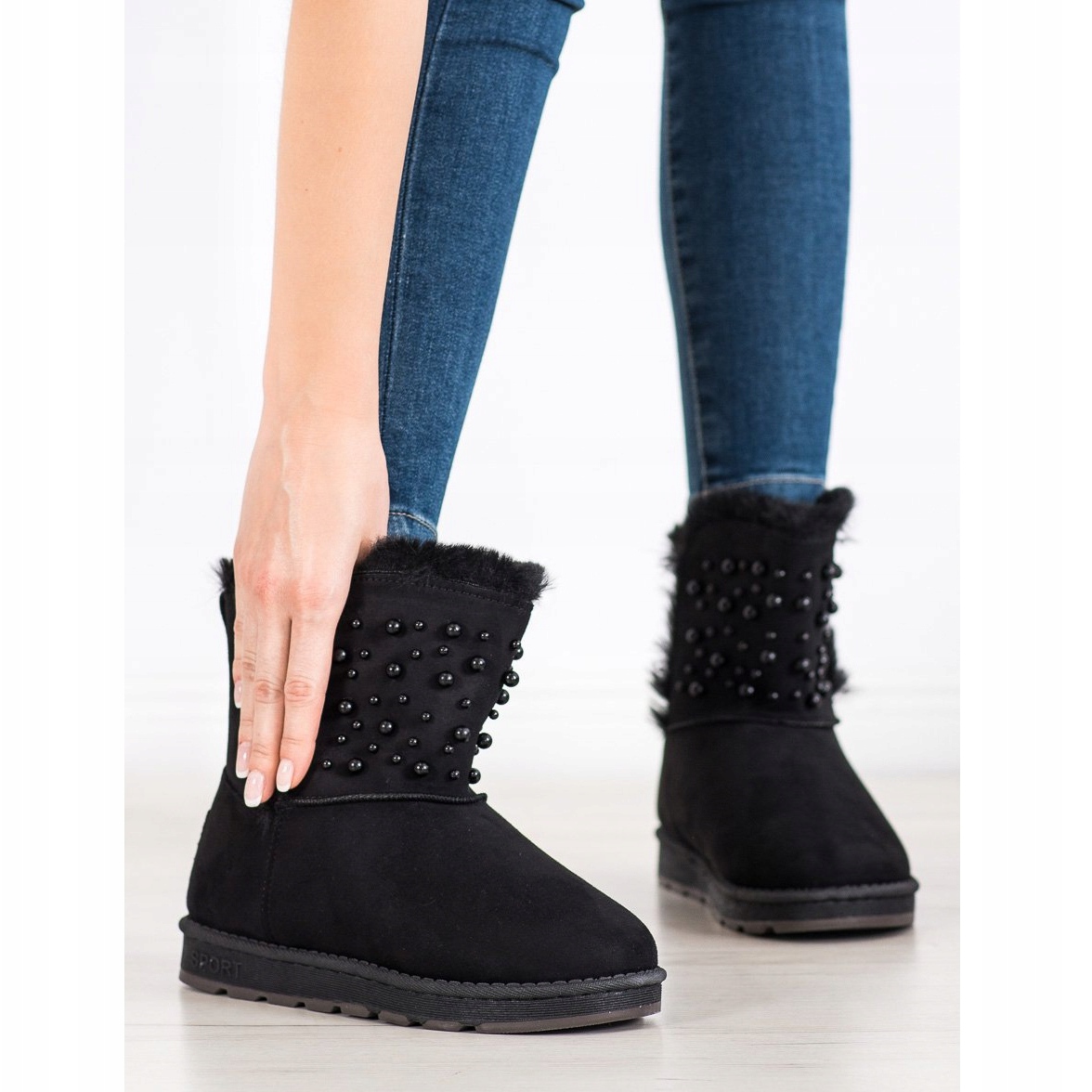 Feitos de couro camurça preto ecológico, estes sapatos slip-on apresentam uma parte superior até o tornozelo para maior proteção contra o frio. Elementos decorativos em forma de tachas pretas e strass conferem-lhes um caráter único, chamando a atenção e acrescentando um pouco de cool punk.