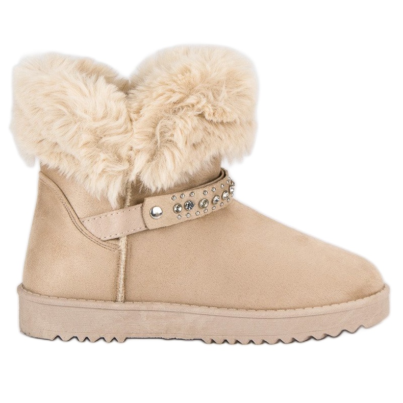 Os Mukluks são caracterizados pelo pelo macio, que além de proporcionar calor, confere ao conjunto um visual extremamente agradável. O tom sutil de marrom faz com que combinem perfeitamente com vários estilos de inverno, e os strass decorativos os tornam chiques e modernos.