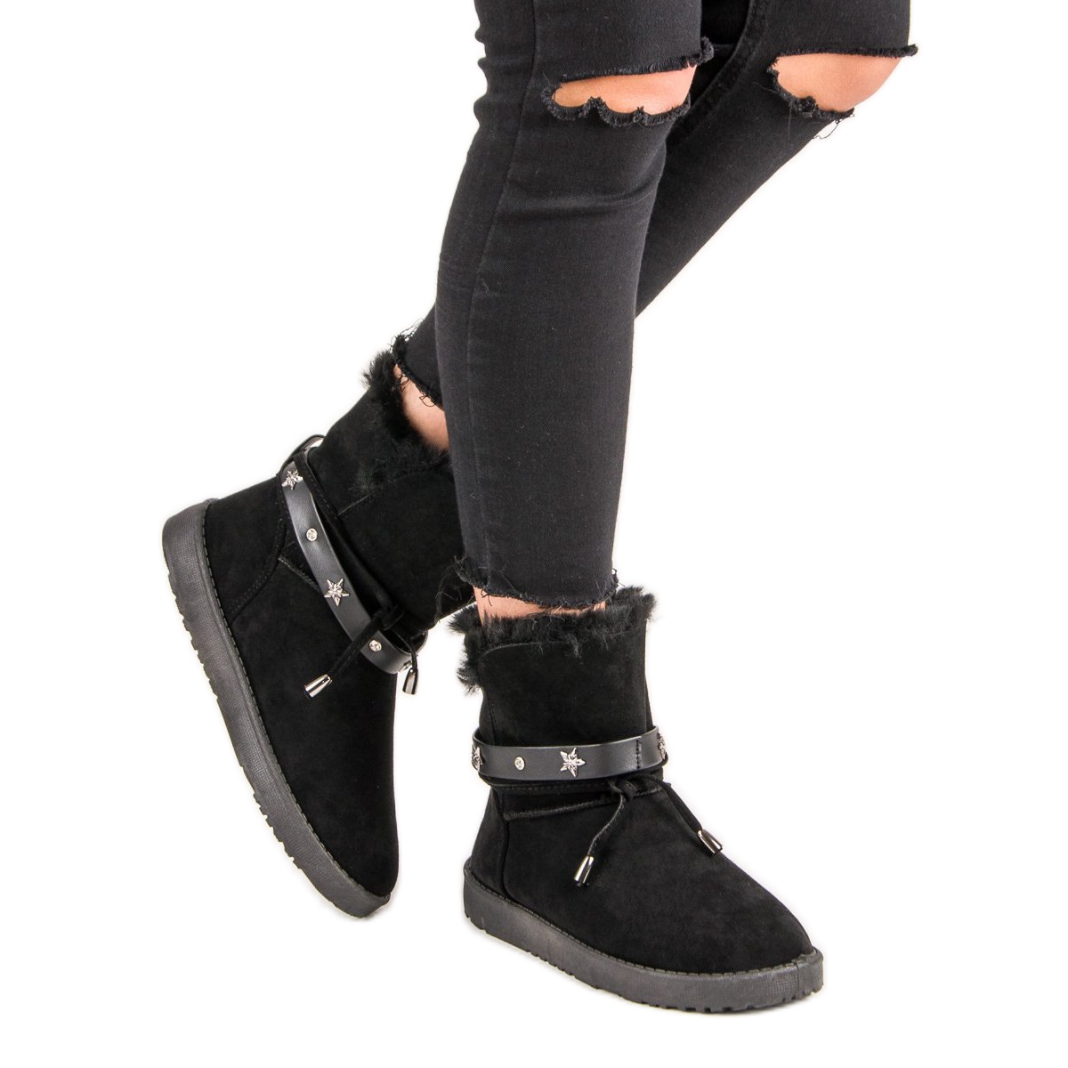 A parte superior acima do tornozelo não é apenas um detalhe da moda, mas também garante proteção contra o frio. Além disso, um cinto decorativo confeccionado em couro ecológico e strass metálicos conferem aos sapatos um caráter único, tornando-os um complemento perfeito para qualquer estilo casual.