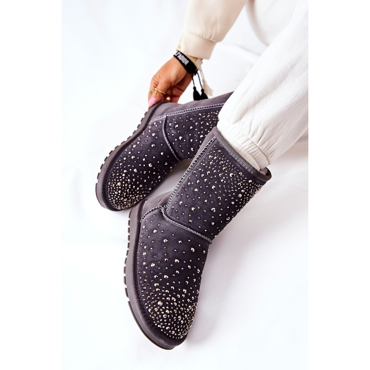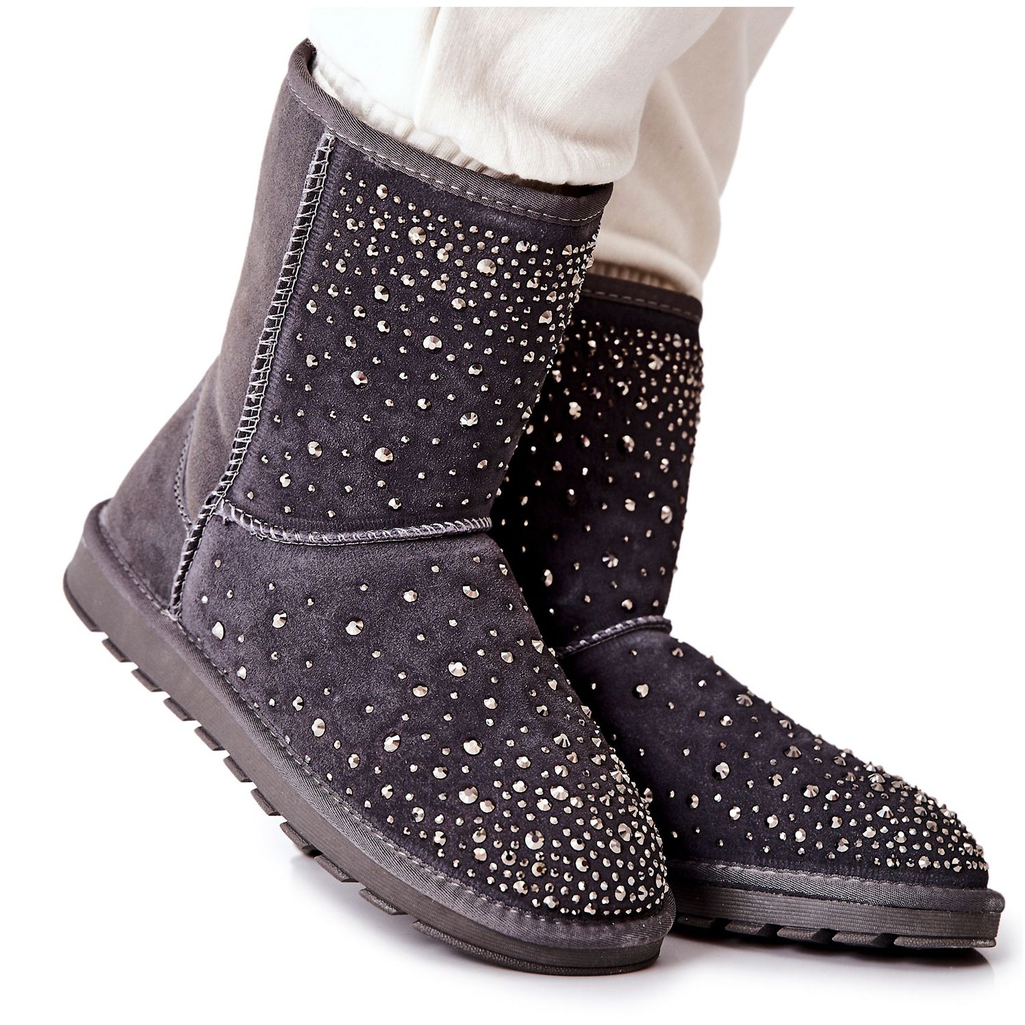 Botas de neve elegantes e quentes que combinam o estilo das mulheres com soluções práticas para o inverno. Feito de camurça natural, decorada com strass cintilantes - perfeitos para saídas geladas, mas eficazes.