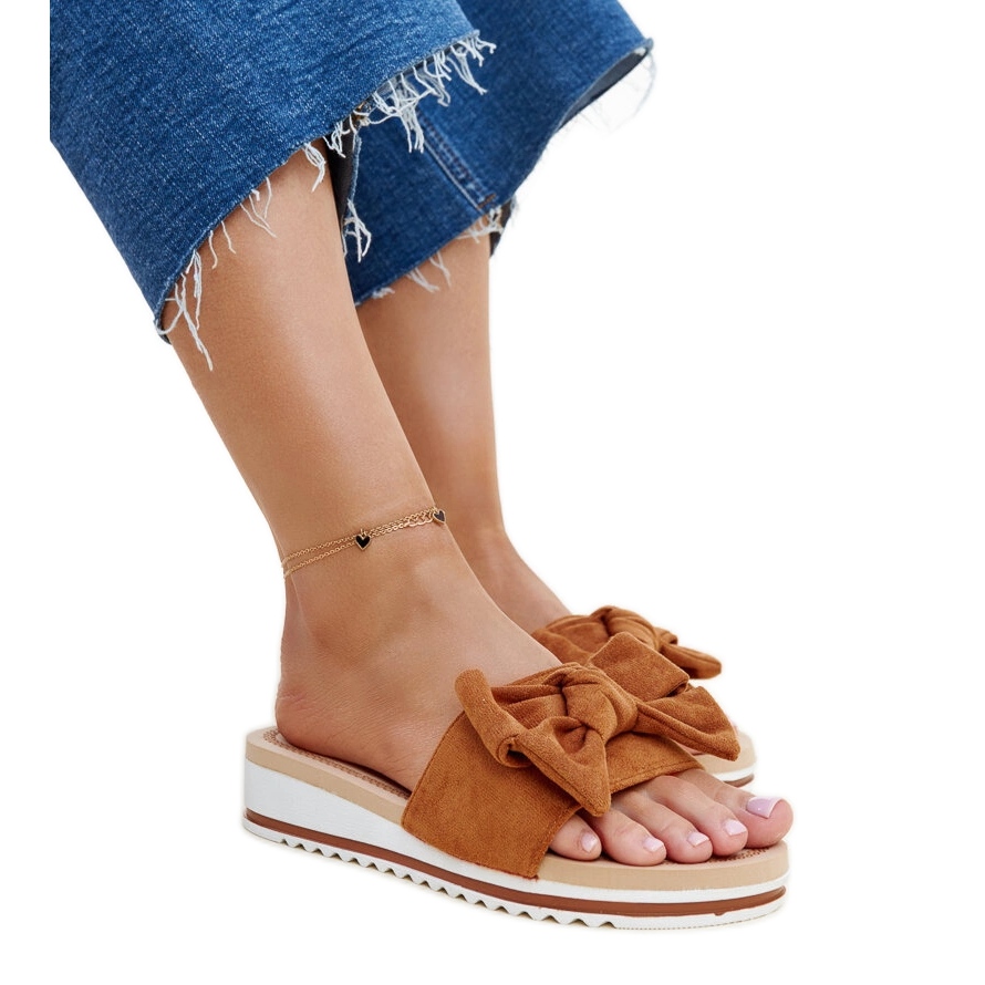 Uma vantagem adicional dessas abas é um arco delicado, o que lhes dá um charme sutil. A cor marrom com uma sola branca significa que o modelo combina perfeitamente com o resto do guarda -roupa de verão. Graças ao corte deslizante, colocar as abas se torna rápido e sem problemas.