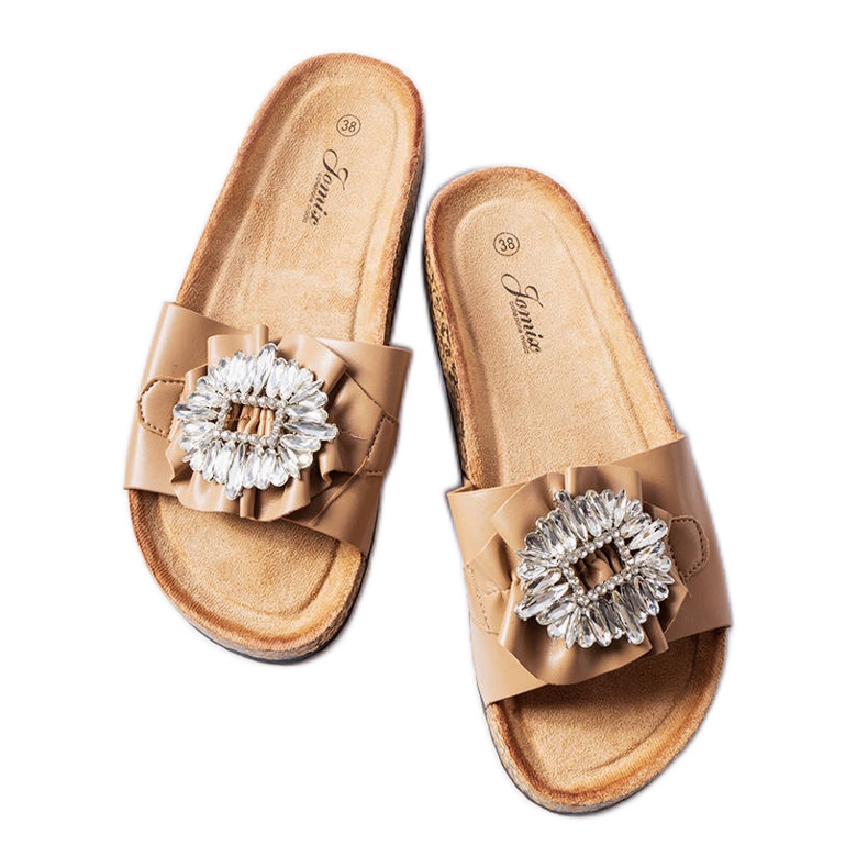 Aposta em conforto e uma aparência elegante com abas Roy em uma plataforma de cortiça. A cor clássica, marrom e dedo redonda faz com que o modelo se encaixe perfeitamente com estilizações de verão diárias. A parte superior feita de couro ecológico de alta qualidade foi decorado com uma fivela sutil de zircônio que acrescenta um sotaque elegante. A sola alta de cortiça de 3 cm em combinação com o fundo de borracha garante amortecimento e estabilidade a cada passo, e a inserção de couro ECO de camurça aumenta o uso de conforto.