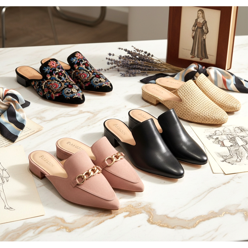 A história das mulas remonta à Europa do século XVI, onde estes sapatos eram usados pela aristocracia como calçado confortável para casa. Eles evoluíram ao longo dos séculos, aparecendo nas passarelas em diversas versões - desde elegantes saltos altos até modelos rasos casuais.