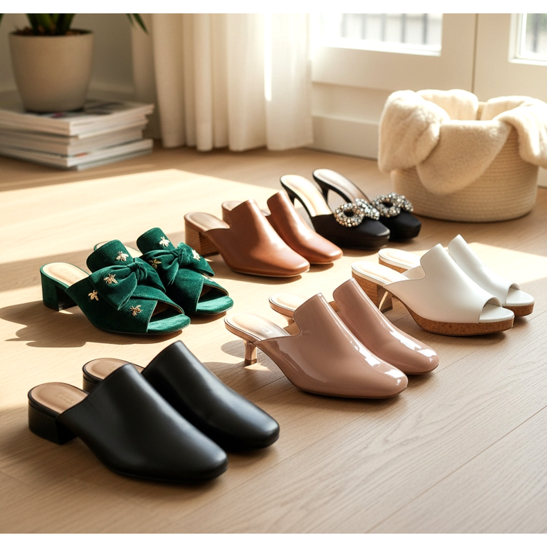 O mercado oferece uma grande variedade de mules, variando em altura de salto, material e estilo. Conheça os modelos mais populares.