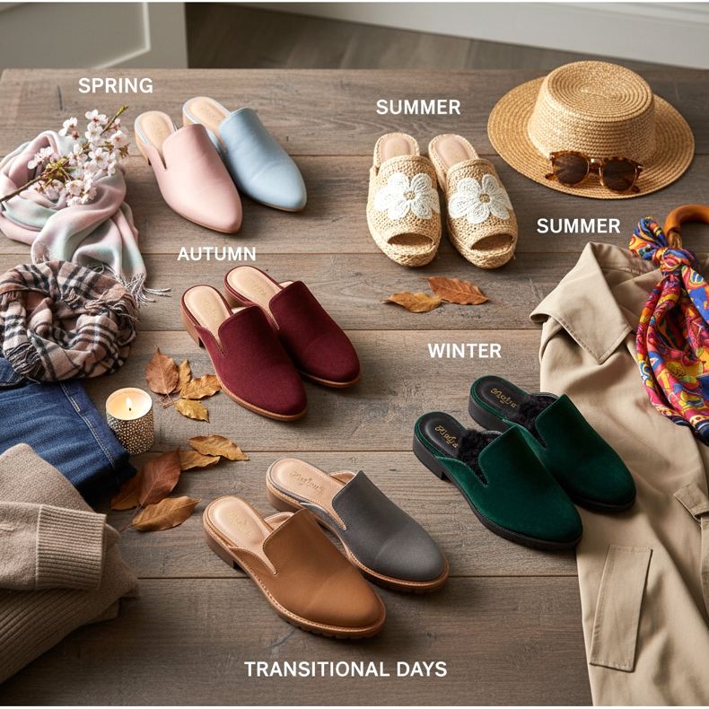 Dias de transição – em tempo incerto, opte por mules com sola mais grossa e parte frontal mais construída. Evite materiais delicados sensíveis à umidade.