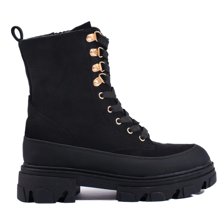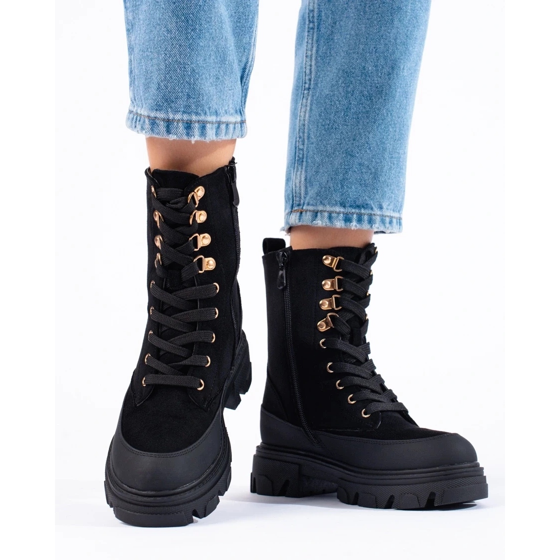 Os trabalhadores modernos de W. Potocki combinam um caráter rock com conforto diário. Feito de camurça ecológica no clássico preto, eles combinam perfeitamente com as estilizações de outono -inverno - eles são isolados e equipados com um cobertor de calçados macios, graças ao qual fornecem calor e conforto, mesmo em baixas temperaturas.