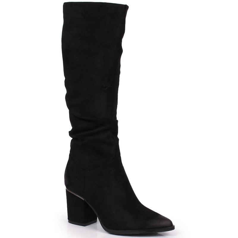 Sapatos projetados para mulheres que procuram cossacos elegantes e práticos diariamente e para resultados mais elegantes. As cores pretas universais se misturam facilmente com um casaco, casaco ou jaqueta de couro.