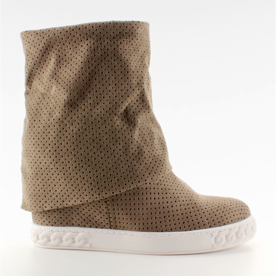 Botins femininos estilosos com cunha oculta que combinam leveza e elegância. Confeccionado em couro camurça ecológico em formato vazado, com cabedal macio e enrolado. O salto oculto de 8 cm molda perfeitamente a figura, mantendo o conforto de uso.