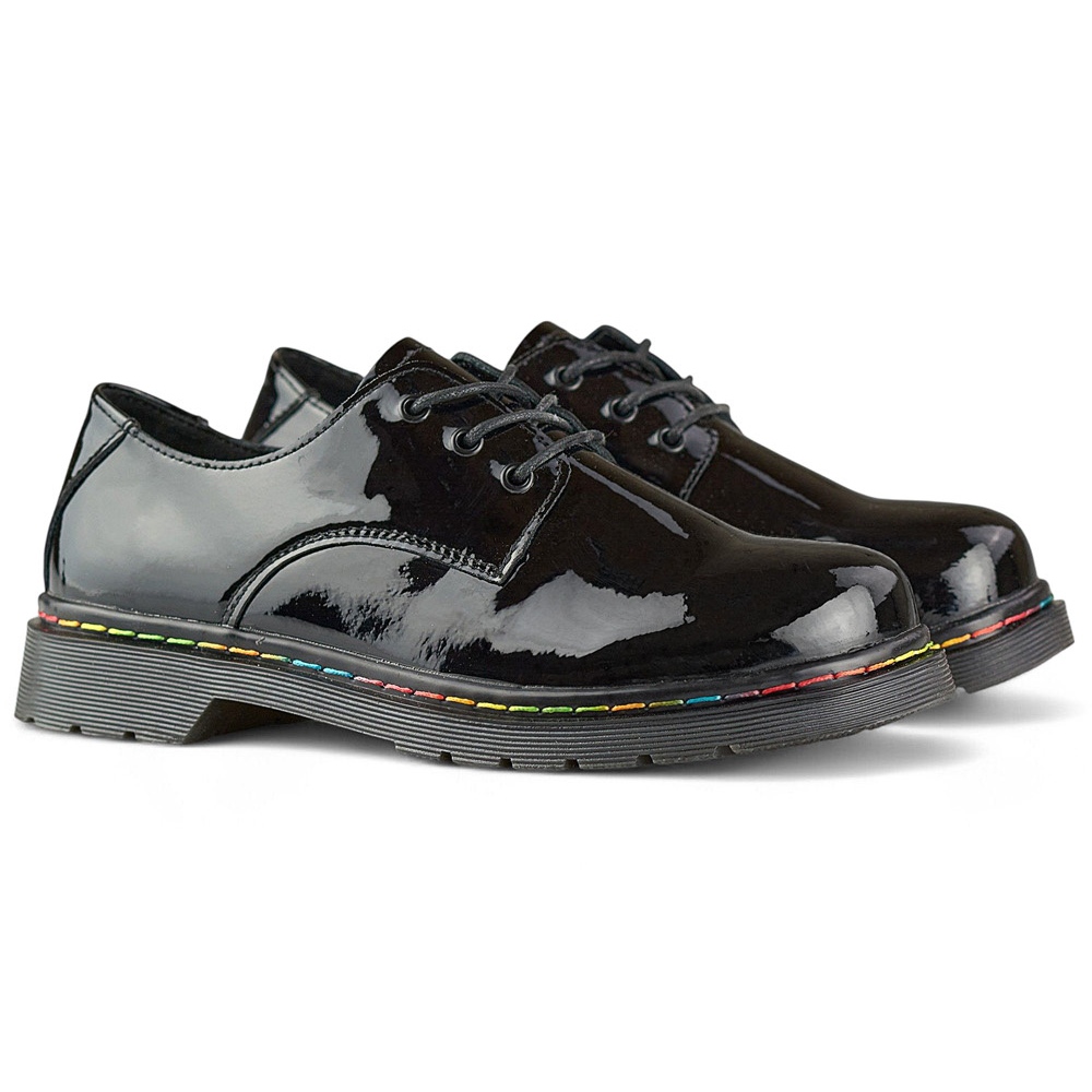 Detalhes: Oxfords femininos de couro preto envernizado, couro natural