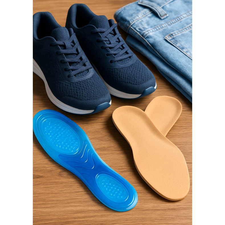 As inserções de gel proporcionam máximo amortecimento e conforto ao ficar em pé ou caminhar por longos períodos de tempo. Fabricados em silicone ou gel de poliuretano, absorvem perfeitamente os choques e reduzem a pressão nos calcanhares, articulações e coluna. Perfeito para pessoas que trabalham em pé (vendedores, chefs, cabeleireiros), atletas, pessoas com sobrepeso e durante longas caminhadas ou passeios turísticos. Disponível na versão completa ou como protetores de calcanhar em gel. Palmilhas viscoelásticas adaptam-se à anatomia individual do pé, proporcionando conforto personalizado. Combinam suavidade com bom suporte. Ótimo para calçados esportivos casuais e uso diário.