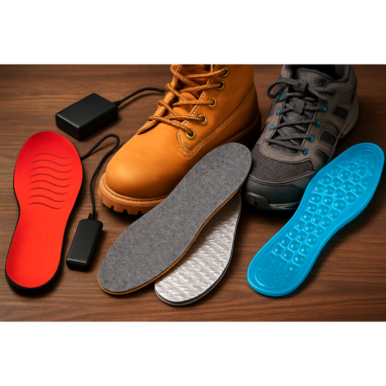 Palmilhas aquecidas, alimentadas por bateria ou carregadas via USB, mantêm os pés aquecidos durante as geadas. Eles oferecem diferentes níveis de aquecimento (geralmente 3-5 níveis), tempo de operação de 4 a 10 horas. Perfeito para atividades ao ar livre, trabalho a frio e esportes de inverno. Inserções de isolamento térmico feitas de materiais como lã, Thinsulate e alumínio refletem o calor do corpo e retêm o calor passivamente. Mais leve, mais barato, não requer carregamento. Ótimo para sapatos de trekking de inverno e botas de trabalho. Palmilhas refrescantes com gel refrescante proporcionam alívio nos dias quentes, reduzem a transpiração e evitam o superaquecimento dos pés. Reativado na geladeira. Perfeito para mensageiros e trabalhadores da construção civil no verão.