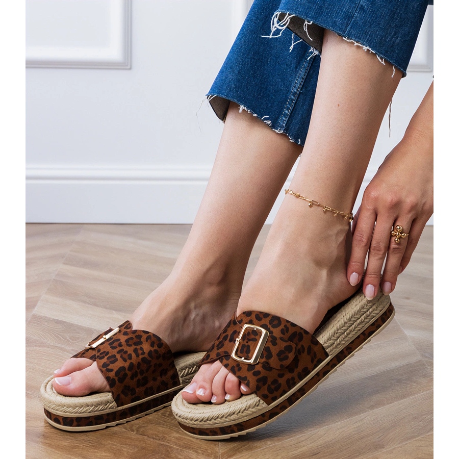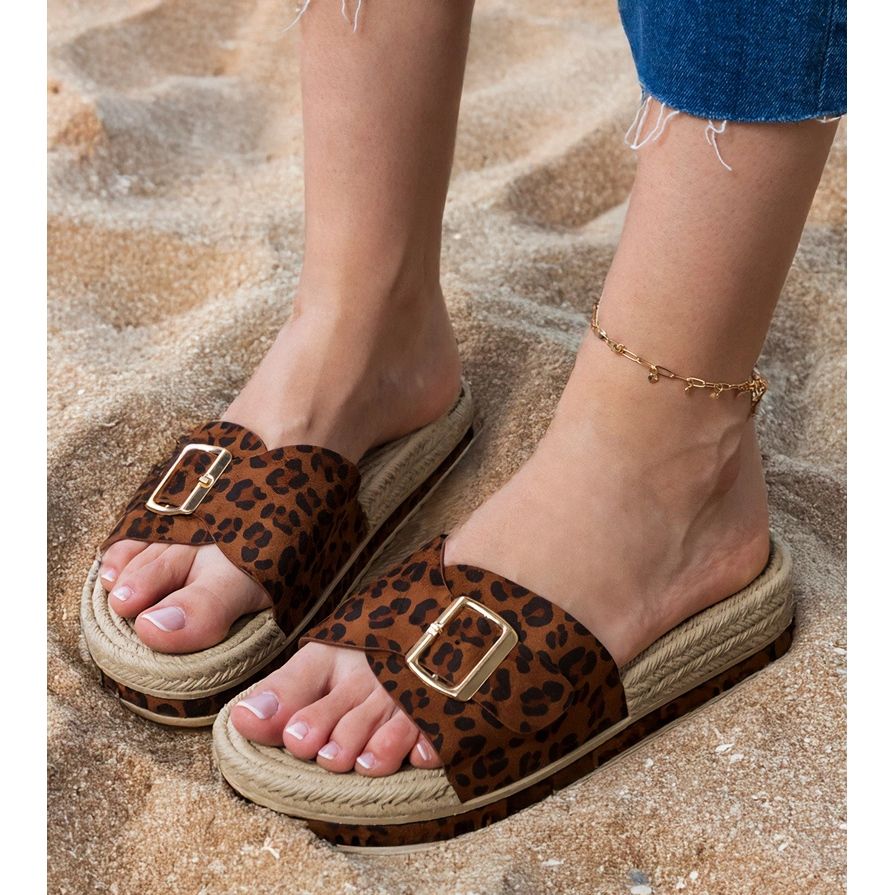 Feito de couro de camurça ecológica de alta qualidade, esses chinelos combinam elegância com o estilo cotidiano. Eles são caracterizados por um padrão de leopardo único que adicionará o caráter de qualquer estilização. Eles se misturam perfeitamente com vestidos de verão e shorts ou jeans casuais.