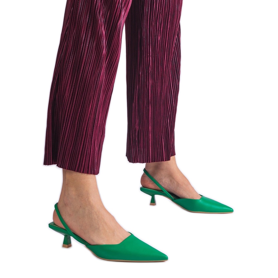 A cor verde das bombas se encaixa perfeitamente nas tendências de verão, e a sola de plástico bege acrescenta contraste sutil. A transportadora pontiaguda enfatiza a elegância de sapatos, tornando -os o complemento perfeito para as estilizações diárias e noturnas.