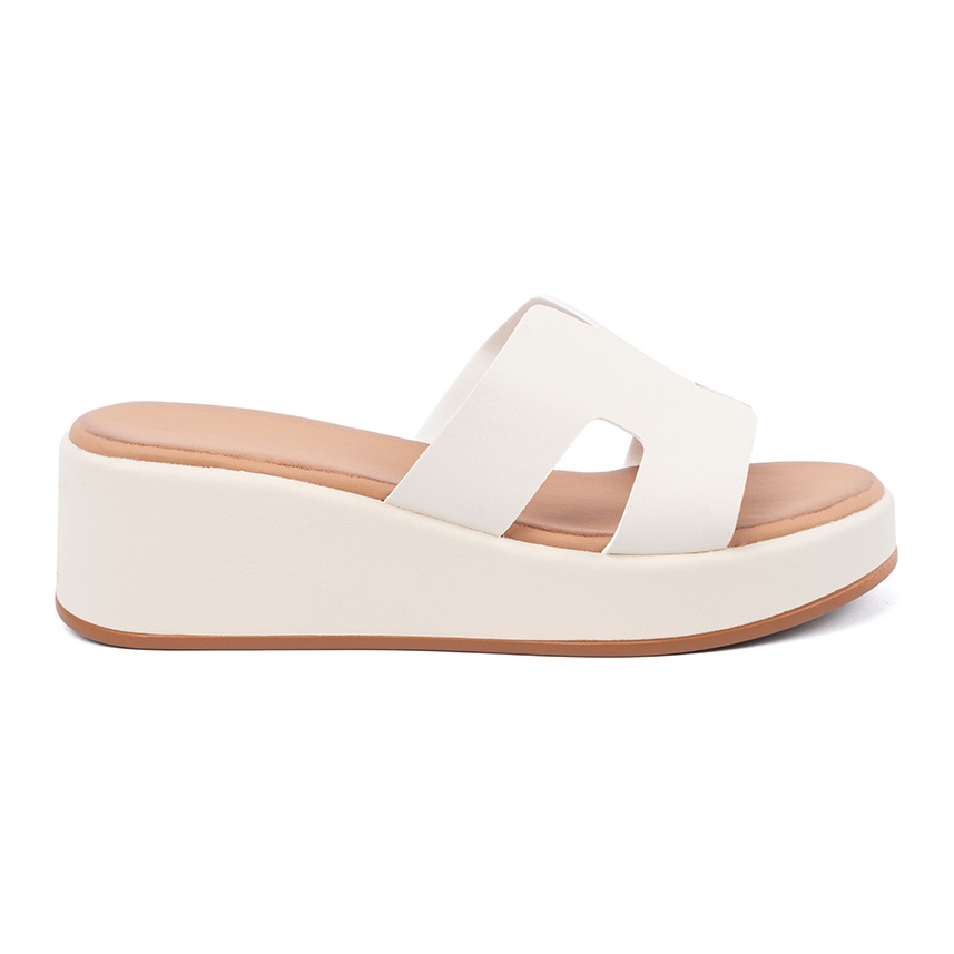 Equipados com uma plataforma de 5 cm de altura, eles não são apenas elegantes, mas também práticos, adicionando a altura certa sem carregar os pés. Os chinelos têm um salto aberto e são inseridos, o que facilita a instalação e a decolagem. Feito de couro orgânico, por dentro e por dentro, é ecológico e oferece conforto ao usar.