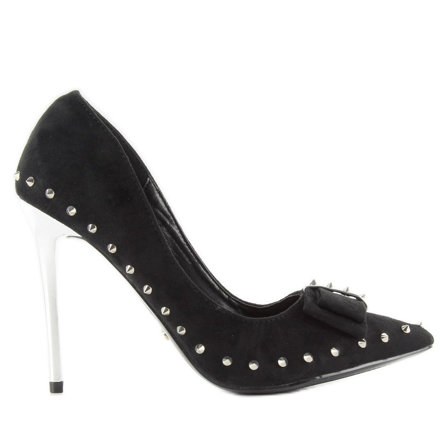 Os saltos altos com tachas e laço na cor preta, modelo nf-05p Black, são sapatos extremamente elegantes que encantam pelo design e conforto de uso. Fabricados em camurça ecológica de alta qualidade, estes scarpins com salto fino de 11 cm de altura são a escolha perfeita para ocasiões especiais e estilo do dia a dia.