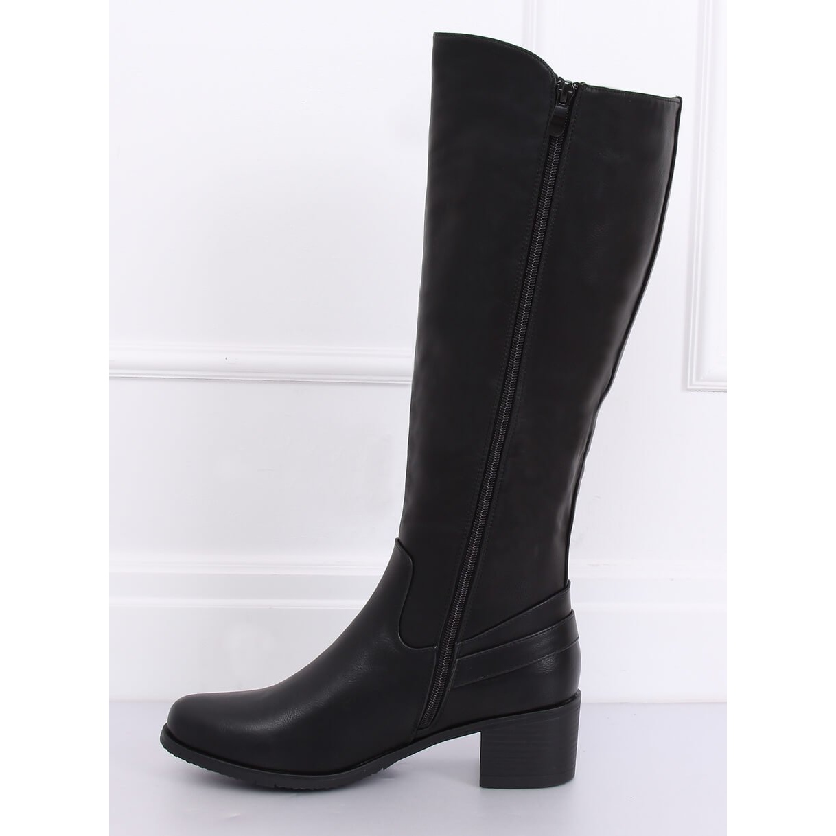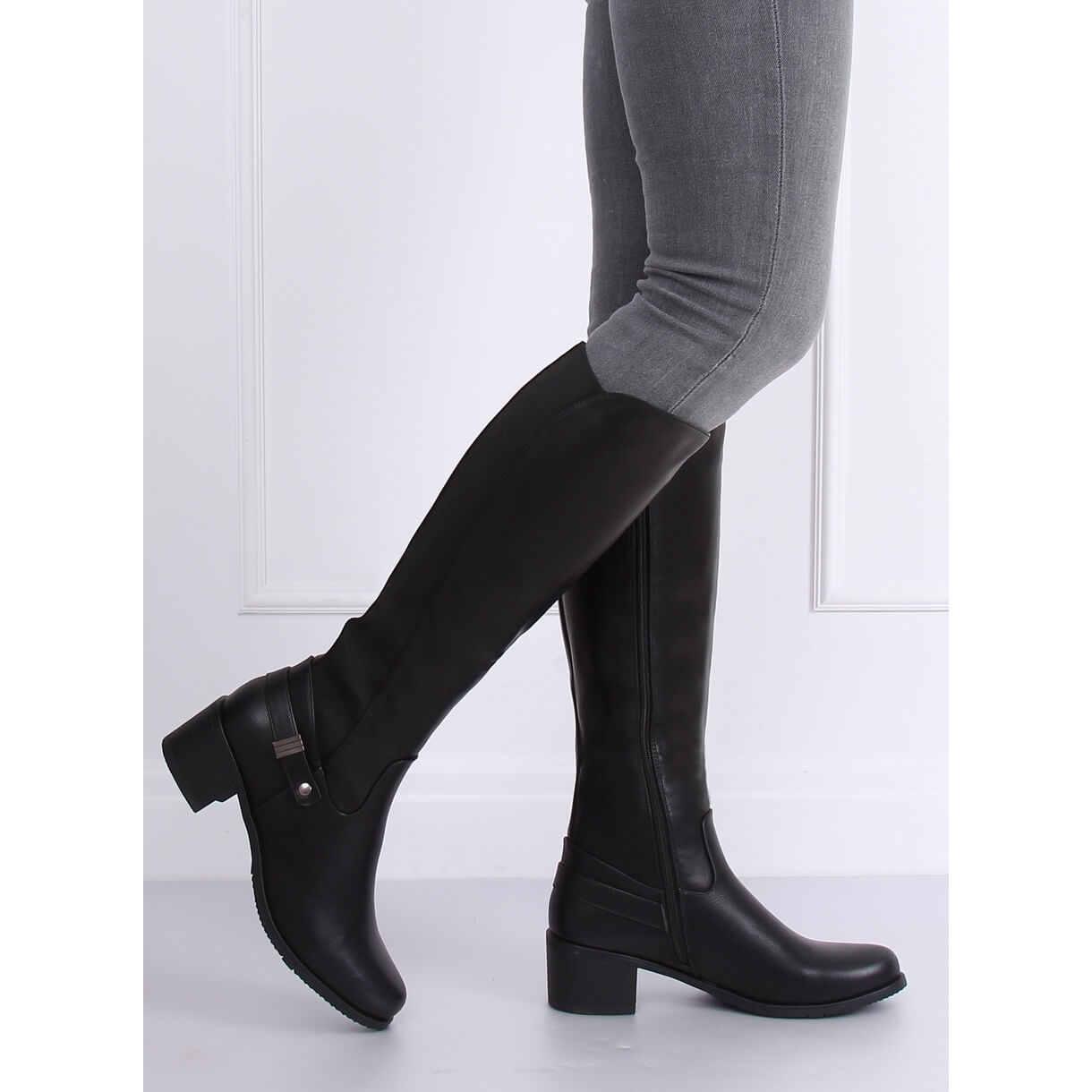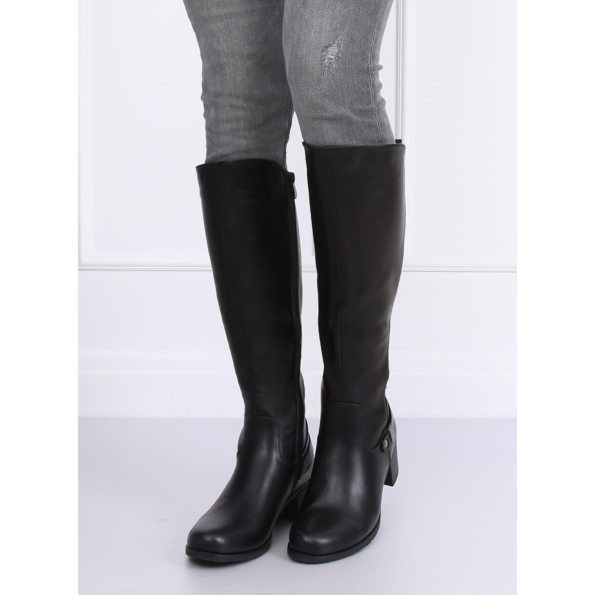 Botas femininas negras elegantes em um salto baixo e estável, com uma altura de 5,5 cm. O corte clássico com nariz redondo funcionará muito bem todos os dias e para mais estilos moderados. A parte elástica da alta garante um ajuste melhor da panturrilha, e a fixação prática do zíper facilita a instalação e a remoção dos sapatos.