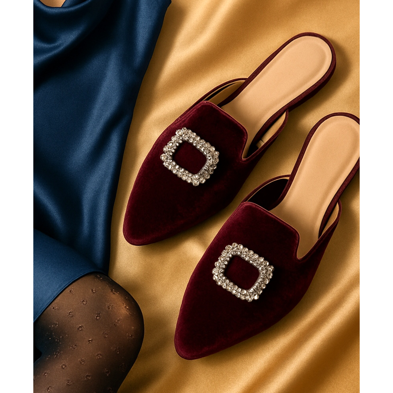 Para as mais corajosas, oferecemos mules de veludo ou cetim com fivela de joia. Embora possam parecer “escorregadios”, quando combinados com um vestido longo slip criam um conjunto extremamente sofisticado. Só lembre-se de cuidar da meia-calça - este ano, as que estão na moda são aquelas com estampas ou fios com glitter, que também vão aquecer os pés nas noites frias.
