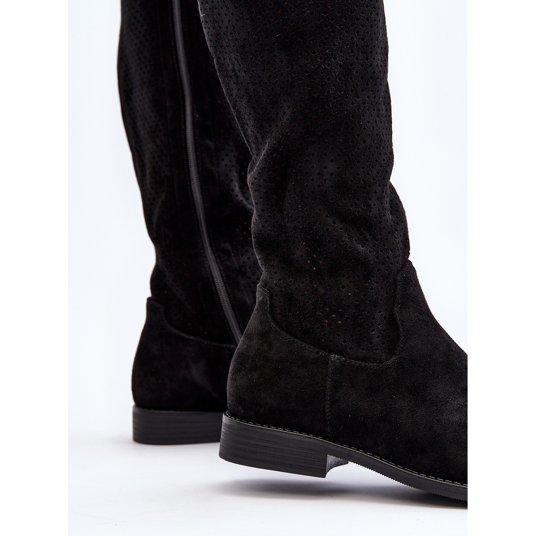 As botas são confeccionadas em camurça ecológica de alta qualidade, o que as torna não só elegantes, mas também ecologicamente corretas. A parte superior vazada acima do joelho chama a atenção, agregando leveza e originalidade a qualquer look. As botas S.Barski pretas deste modelo são um acessório atemporal que combina com diversos estilos.