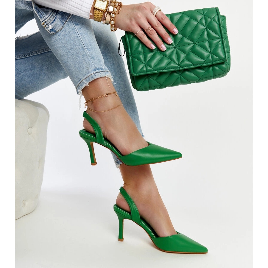 O pino alto com uma altura de 9 cm acrescenta graça a cada etapa, tornando esses sapatos a escolha perfeita para saídas diárias e para ocasiões especiais. A cor verde atrai os olhos e se mistura facilmente com várias estilizações, do clássico ao moderno. A sola bege, feita de plástico, não apenas enfatiza a estética dos sapatos, mas também oferece conforto ao usar.